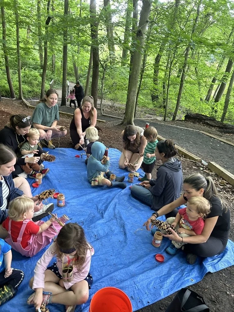 Our Wondertree & Me classes are designed to invite both children and their caregivers to engage in open-ended play prompts that develop creativity, empathy, and encourage joyful play. Each class is one hour long and includes songs and guided play prompts that follow a theme throughout the season. Classes are held outdoors in local greenspaces and are held in all weather, with the exception of dangerous weather.